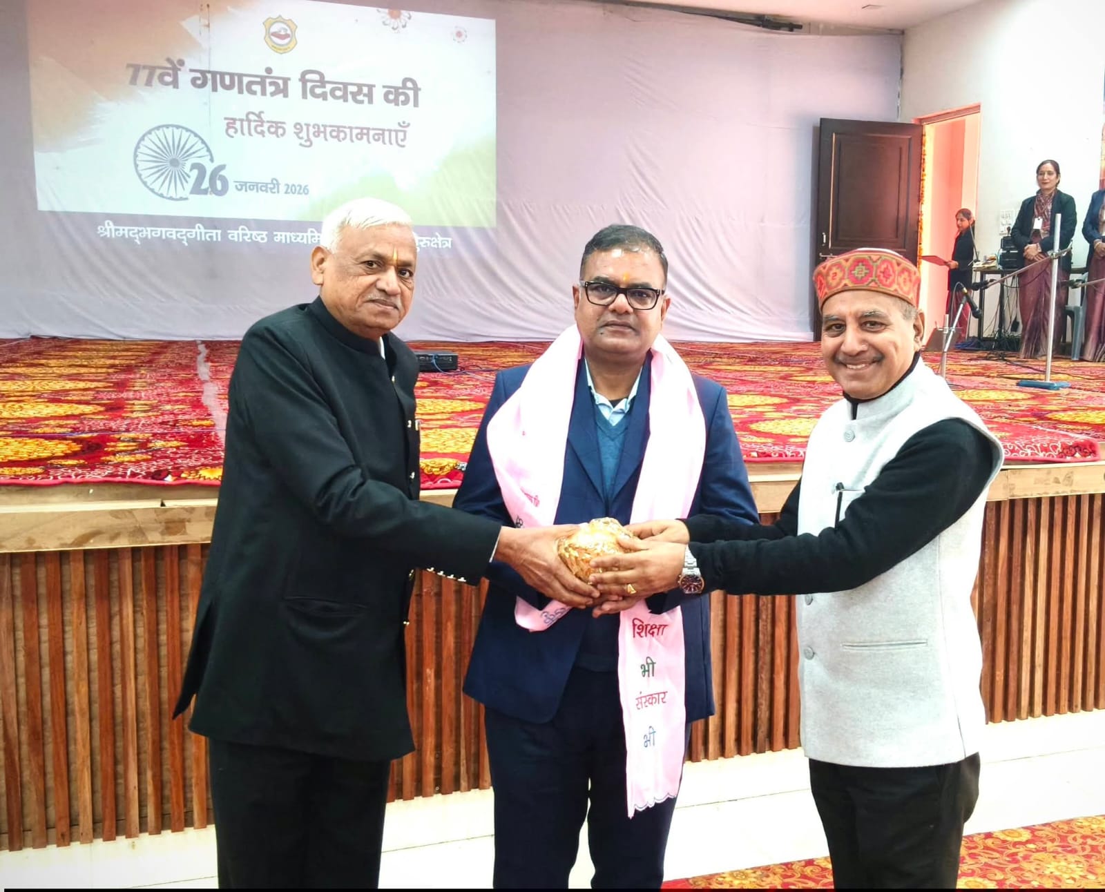 26 जनवरी 2026 को श्रीमद्भागवदगीता वरिष्ठ माध्यमिक विद्यालय कुरुक्षेत्र में 77वें गणतंत्र दिवस को धूमधाम से मनाया गया । कार्यक्रम का शुभारंभ मुख्य अतिथि विनय गुप्ता (उद्योगपति) व पूर्व छात्र डी पी चौधरी (वॉइस चेयरमैन, जिला परिषद )द्वारा ध्वजारोहण कर किया गया । इसके पश्चात दीप प्रज्वलित करके सांस्कृतिक कार्यक्रम का शुभारंभ किया गया। कार्यक्रम की शुरुआत में प्राचार्य अनिल मदान के द्वारा मुख्य अतिथियों का परिचय करवाया गया और प्रबंध समिति के सदस्यों के द्वारा उन्हेंअंग वस्त्र व श्रीफल भेंट कर अतिथियों का स्वागत किया गया । इसके पश्चात बच्चों के द्वारा सांस्कृतिक कार्यक्रम प्रस्तुत किए गए। सांस्कृतिक कार्यक्रमों के माध्यम से बच्चों ने अपने देश के विषय में तथा भारतीय संविधान की महत्वता को प्रस्तुत किया। छात्रों के द्वारा अनेक मनमोहक प्रस्तुतियां प्रस्तुत की गई जिसे देखकर दर्शकों ने जोरदार तालियों से उनका स्वागत किया। मुख्य अतिथि के द्वारा मुख्य उद्बोधन में बच्चों को देश के भविष्य के बारे में बताया कि हम अपना चरित्र निर्माण किस प्रकार कर सकते हैं मुख्य अतिथि के द्वारा बालकों को पुरस्कार देकर पुरस्कृत किया गया। कार्यक्रम के अंत में विद्यालय के प्रबंधक वीरेंद्र वालिया ने सभी का आभार व्यक्त किया। इस अवसर पर अशोक गर्ग, संजीव गर्ग , विद्यालय के निर्देशक व पूर्व प्रधानाचार्य अनिल कुलश्रेष्ठ व विद्यालय के अध्यक्ष मोहिंदर सिंगला , कोषाध्यक्ष रमेश गुलाटी,आदरणीय जंगबहादुर व अन्य गणमान्य लोग उपस्थित रहे।